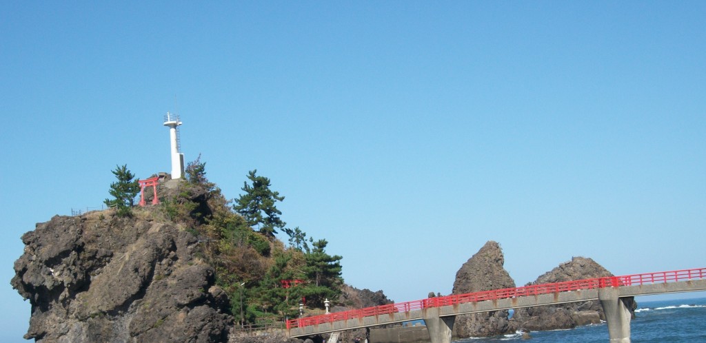 {◎ソードボール島のイメージモデルとなった能生港灯台(のうこうとうだい)(新潟県)です…“No”が英語の否定で「反戦」っぽいなぁと思い…あと、神社が併設されていて「恋人の聖地」だそうです…小さな島と橋が可愛いながらも神秘的…}