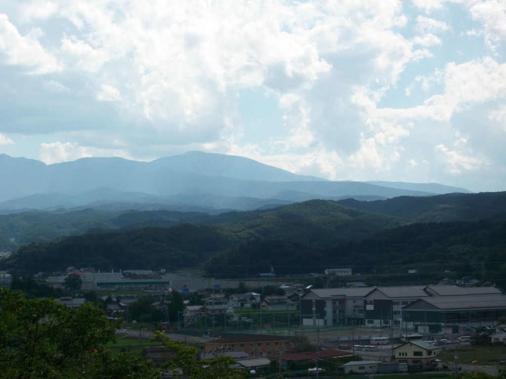 {◎コスモタワーがある公園より。一番奥の山の右側の辺りが宇宙観測所。拡大すれば上を向いてるパラボラアンテナが見える…かも?}