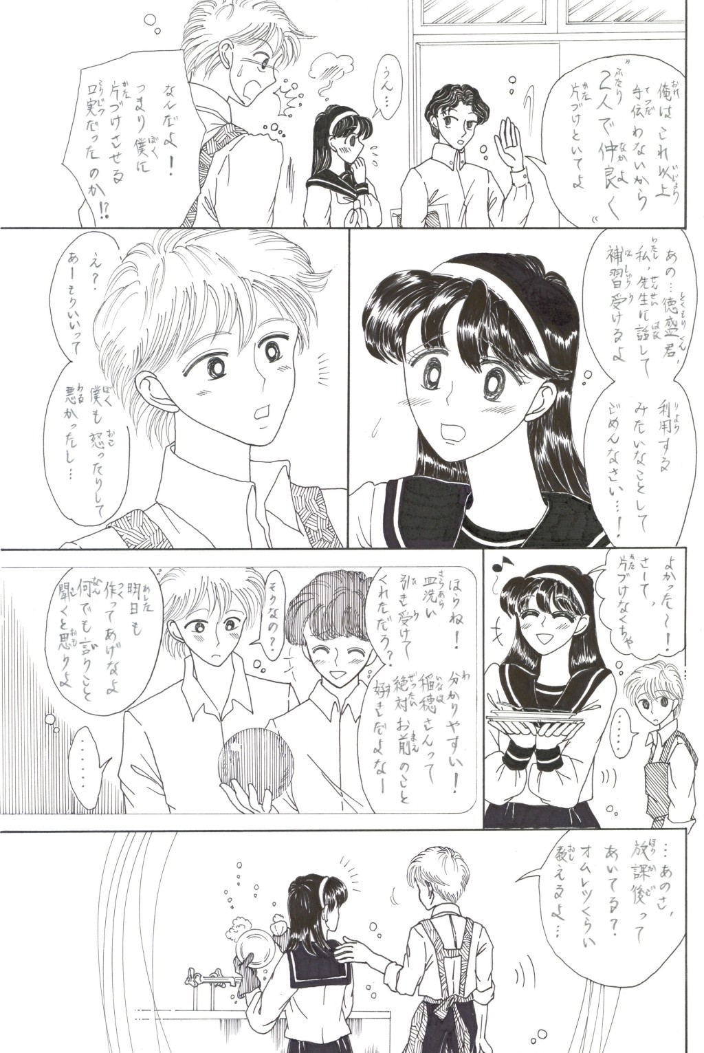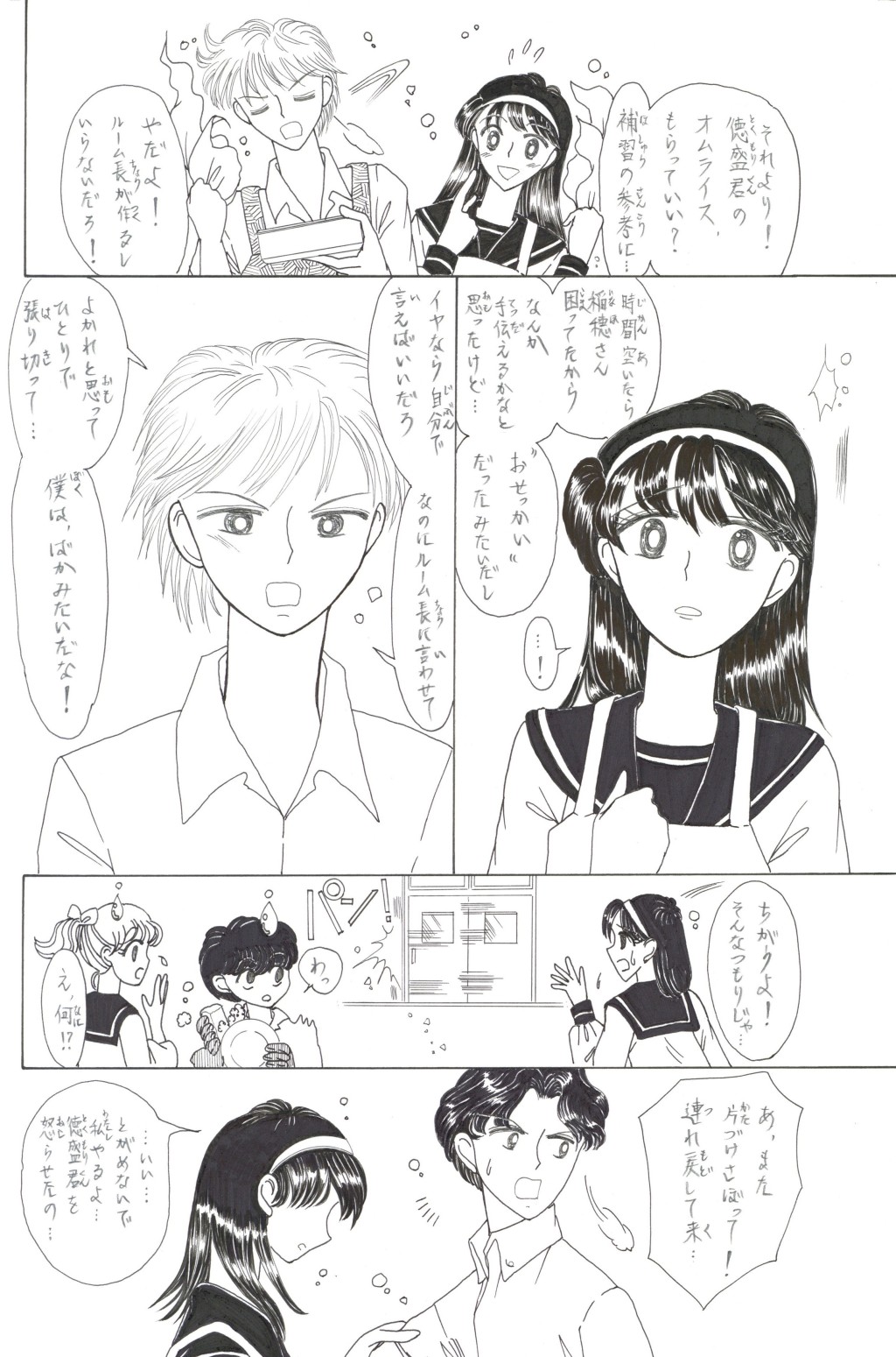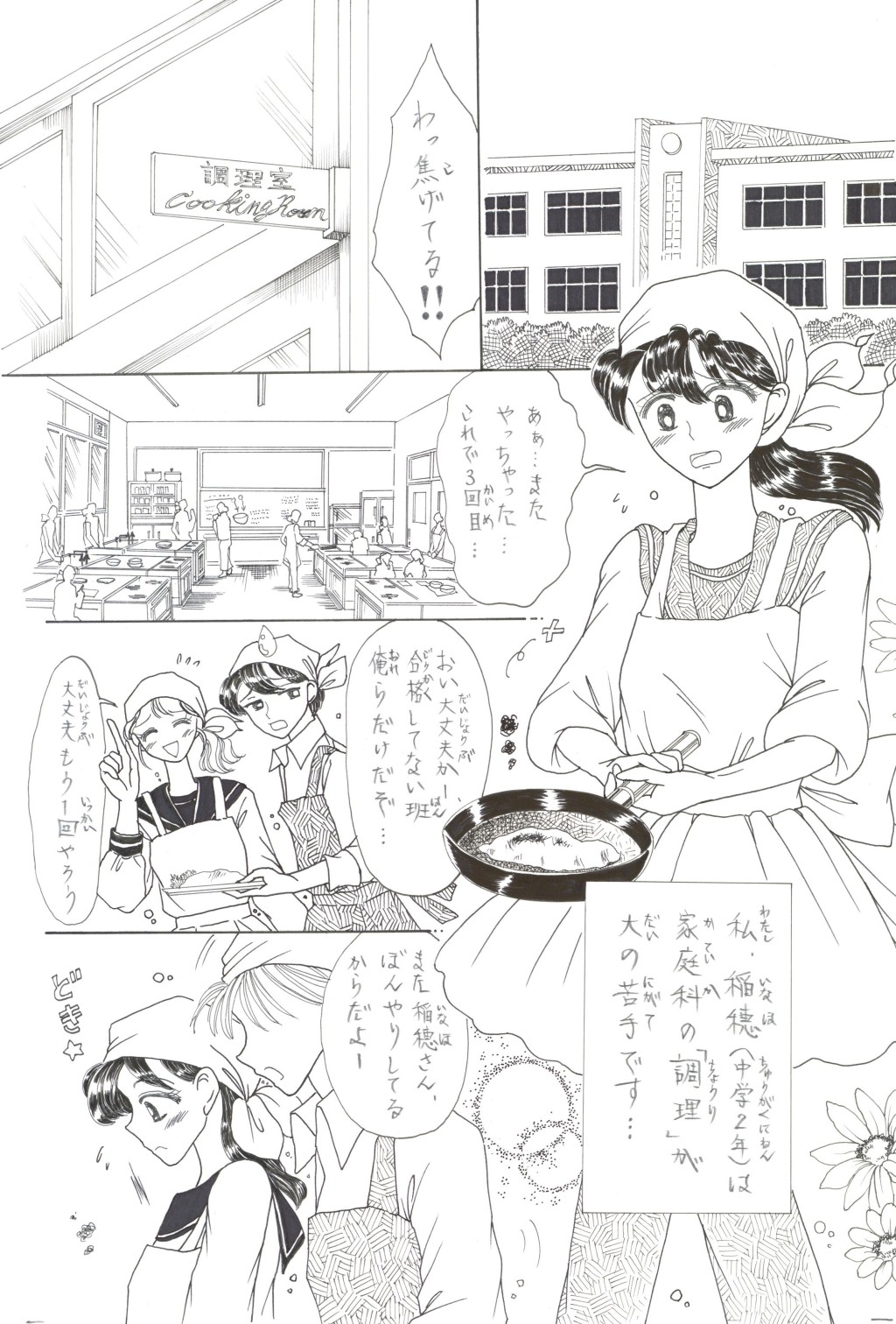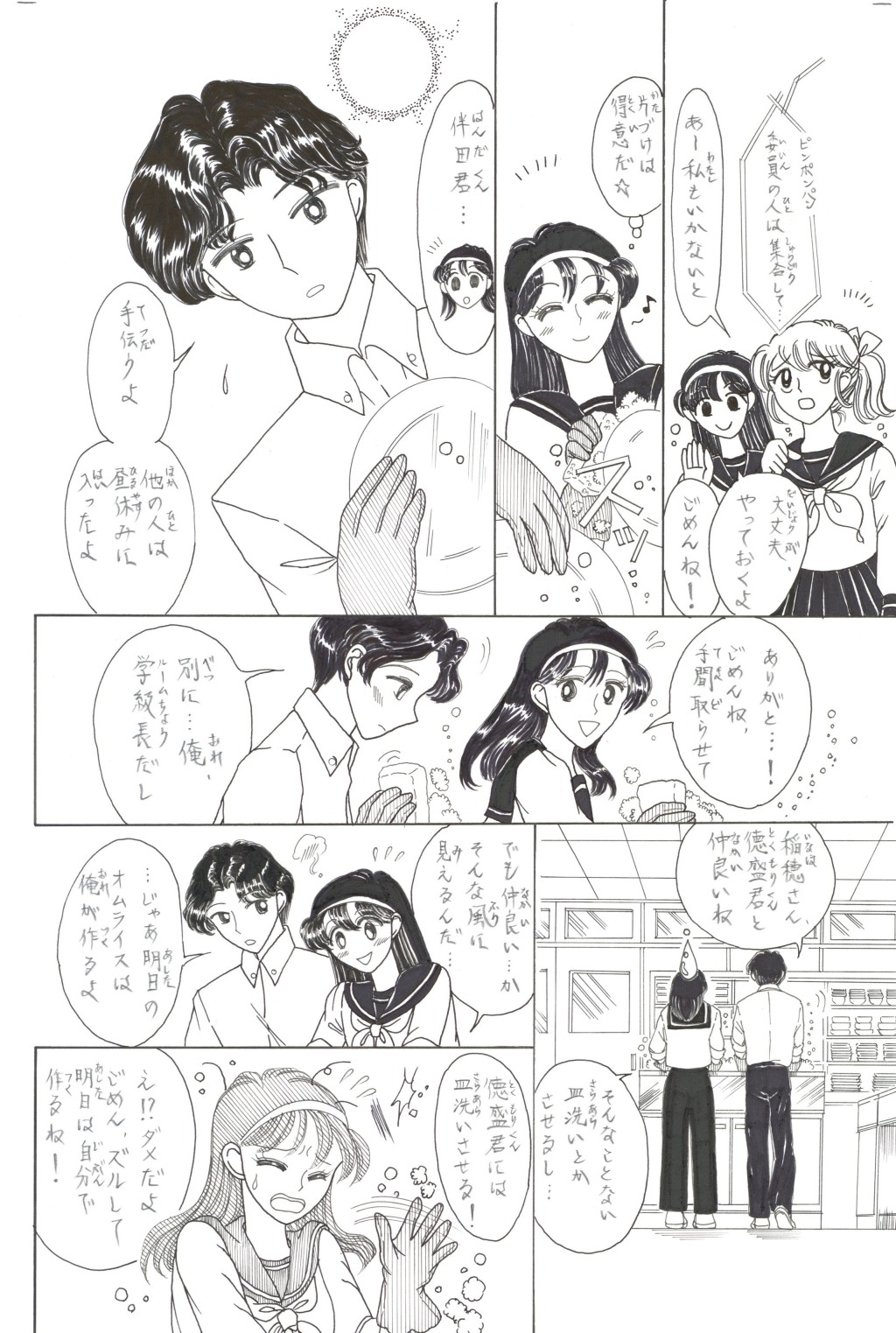 ◆中学2年の「稲穂(いなほ)さん」は,家庭科の「調理」が大の苦手.そんな時,片思いの「徳盛(とくもり)君」が得意の料理でオムレツを作ってくれる.補習を免(まぬが)れた見返りとして頼まれた皿洗いを,喜(よろこ)んで引き受うける稲穂.しかしそれを見た学級長(ルームちょう)「伴田(はんだ)君」は翌日,徳盛君を注意する.稲穂が伴田君に告げ口をして,咎(とが)めさせたのだと誤解(ごかい)されてしまい….