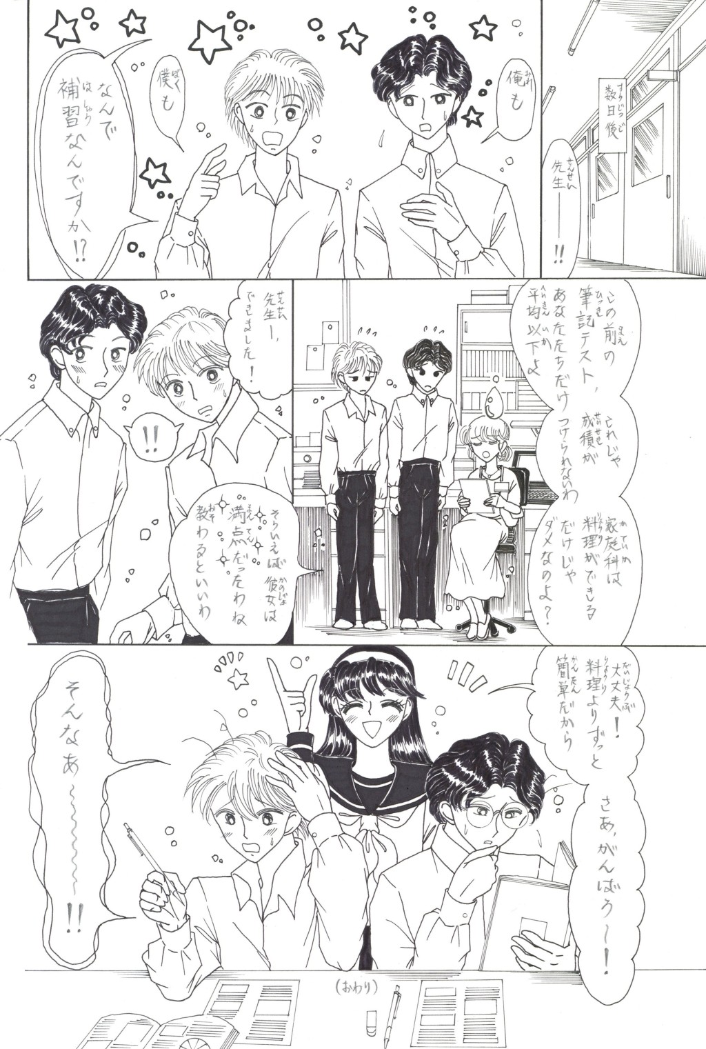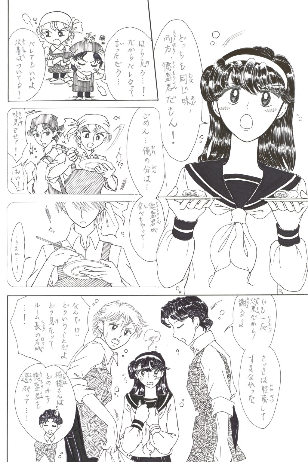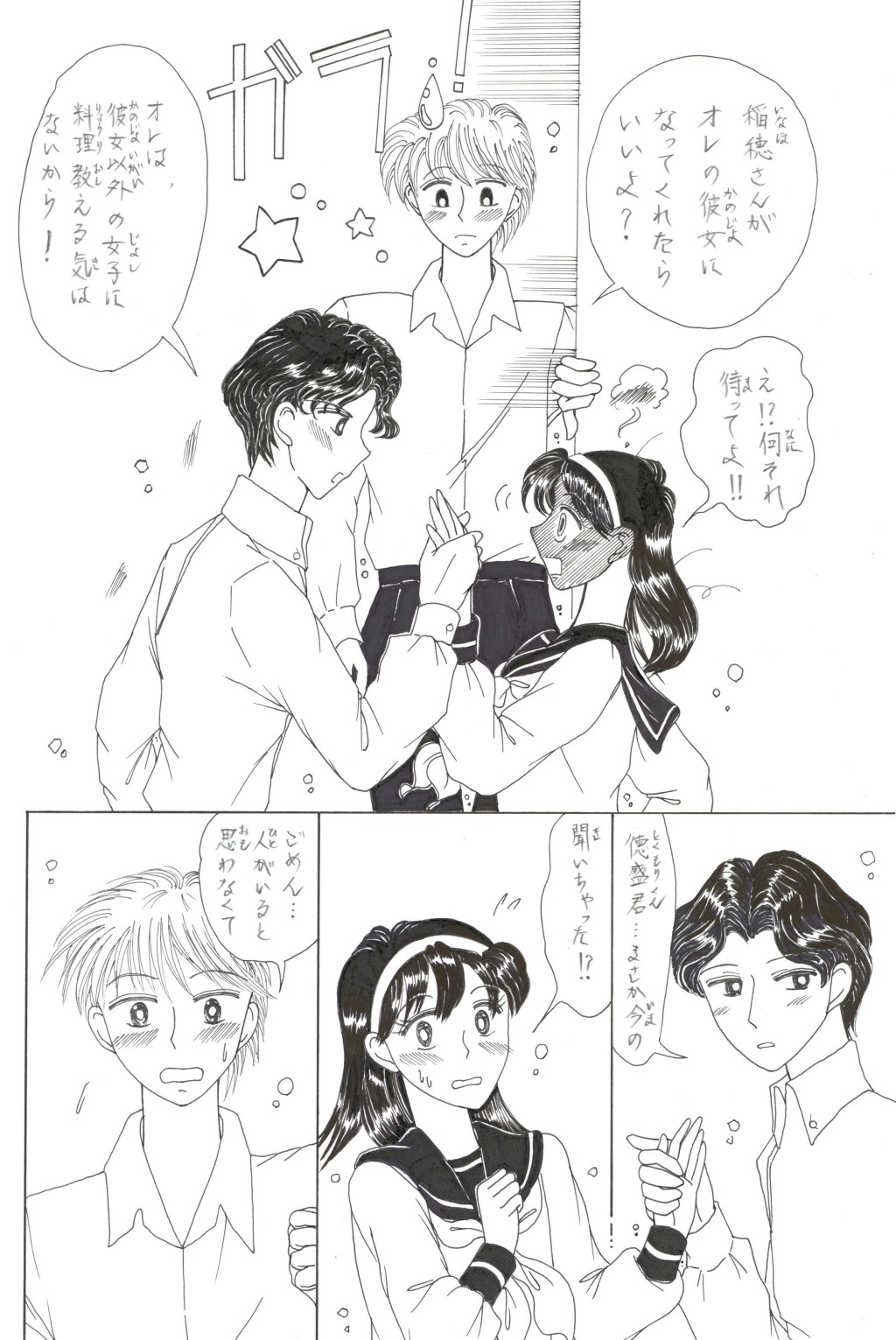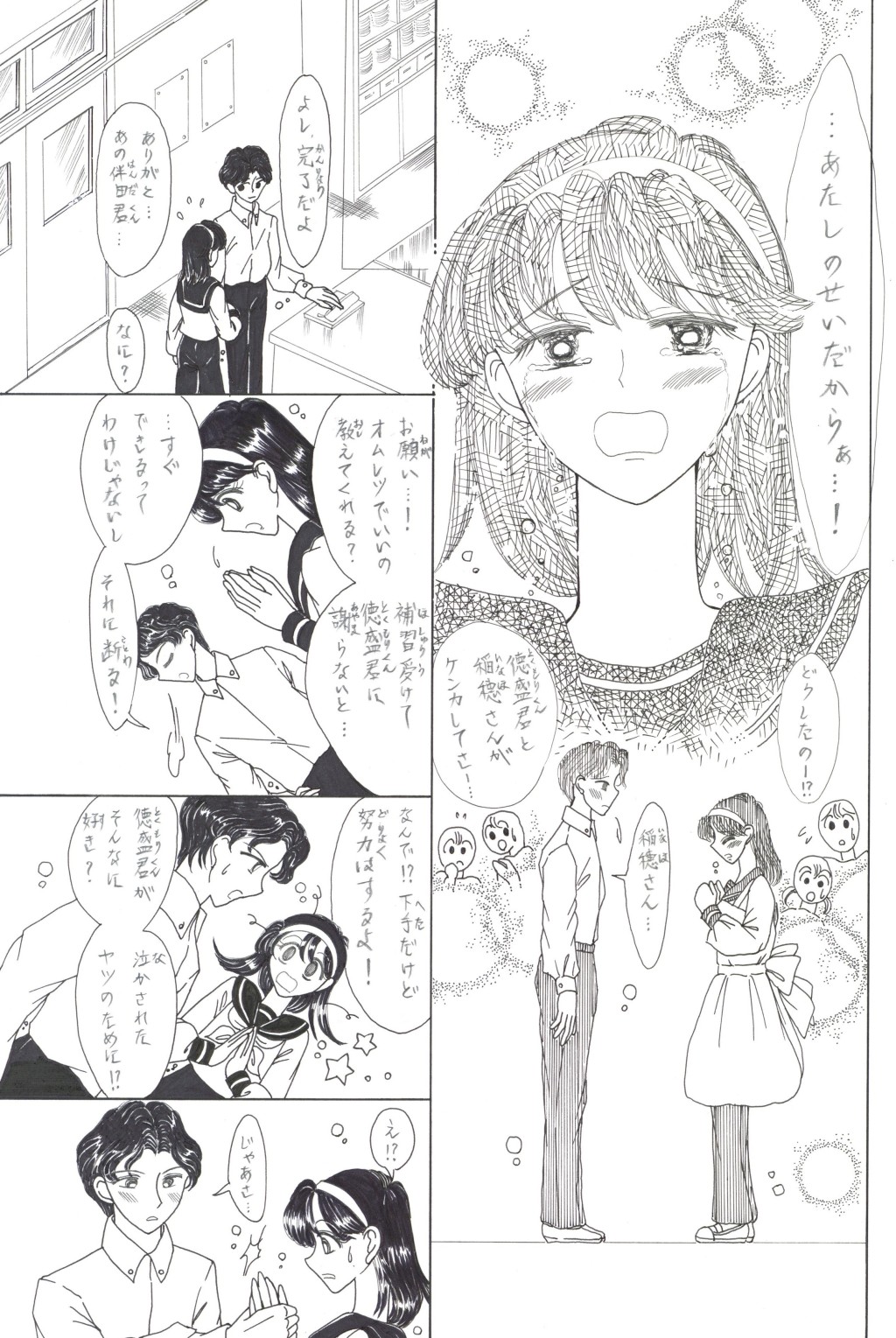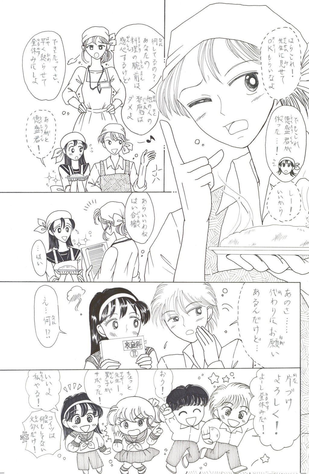 ◆中学2年の「稲穂(いなほ)さん」は,家庭科の「調理」が大の苦手.そんな時,片思いの「徳盛(とくもり)君」が得意の料理でオムレツを作ってくれる.補習を免(まぬが)れた見返りとして頼まれた皿洗いを,喜(よろこ)んで引き受うける稲穂.しかしそれを見た学級長(ルームちょう)「伴田(はんだ)君」は翌日,徳盛君を注意する.稲穂が伴田君に告げ口をして,咎(とが)めさせたのだと誤解(ごかい)されてしまい….